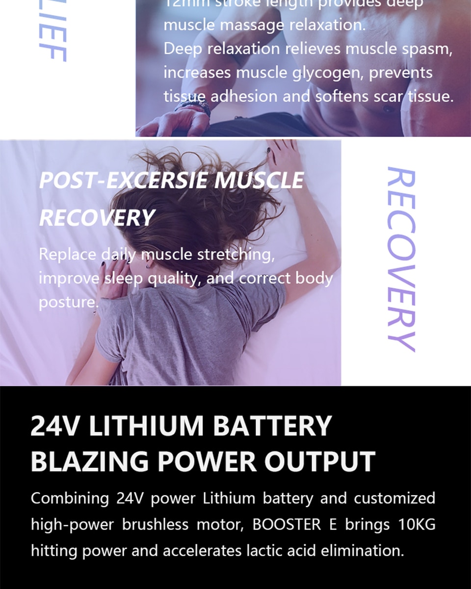 Booster E (extreme) is a percussive massager with 9 levels of powerful speed setting. Booster E can be used for warn-up, cool-down, functional training, rehabilitation and physical therapy. This precision engineered massage gun is the best friend of fitness enthusiasts the world over. With a striking design outside and advanced technology inside, Booster E delivers high-penetration muscle relief and a faster, more effective recovery.